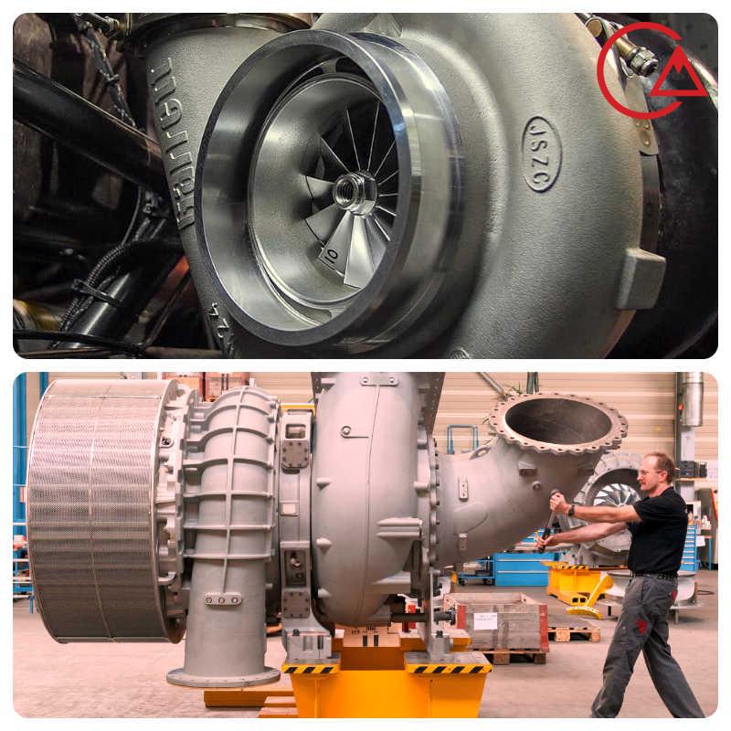 توربو شارژر گاز اگزوز در بخش; سمت توربین (گاز اگزوز)، سمت راست کمپرسور (هوای ورودی)